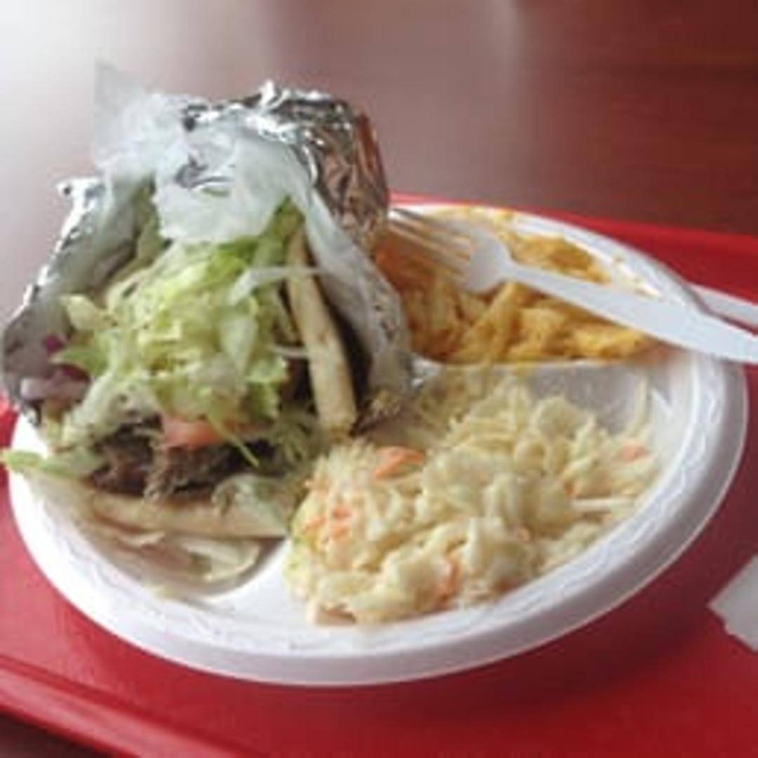 Savory seasoned meat (typically lamb or beef) shaved from a rotating spit, wrapped in warm pita bread with toppings such as tomatoes, onions, and creamy tzatziki sauce.
