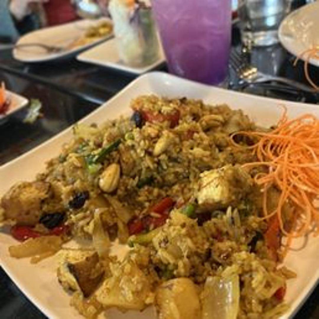 A unique and flavorful Thai fried rice served in a hollowed-out pineapple (sometimes). Stir-fried with rice, shrimp (often included), chicken (often included), pineapple chunks, cashew nuts, raisins, egg, onions, carrots, peas, and a touch of curry powder. The dish offers a delightful blend of sweet, savory, and nutty flavors, with a tropical twist.