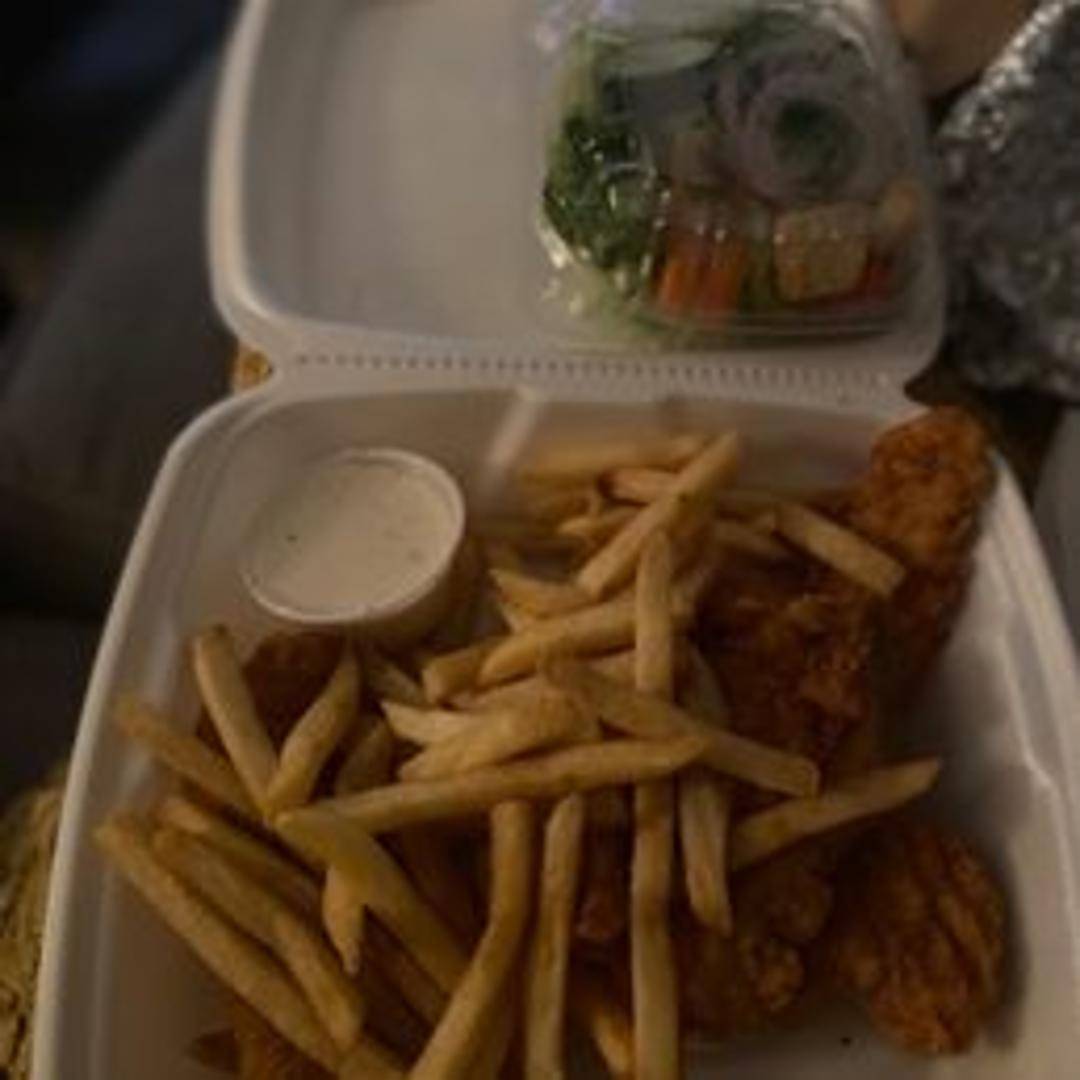 A generous serving of crispy, golden-brown chicken fingers served with french fries, coleslaw, and your choice of dipping sauce.