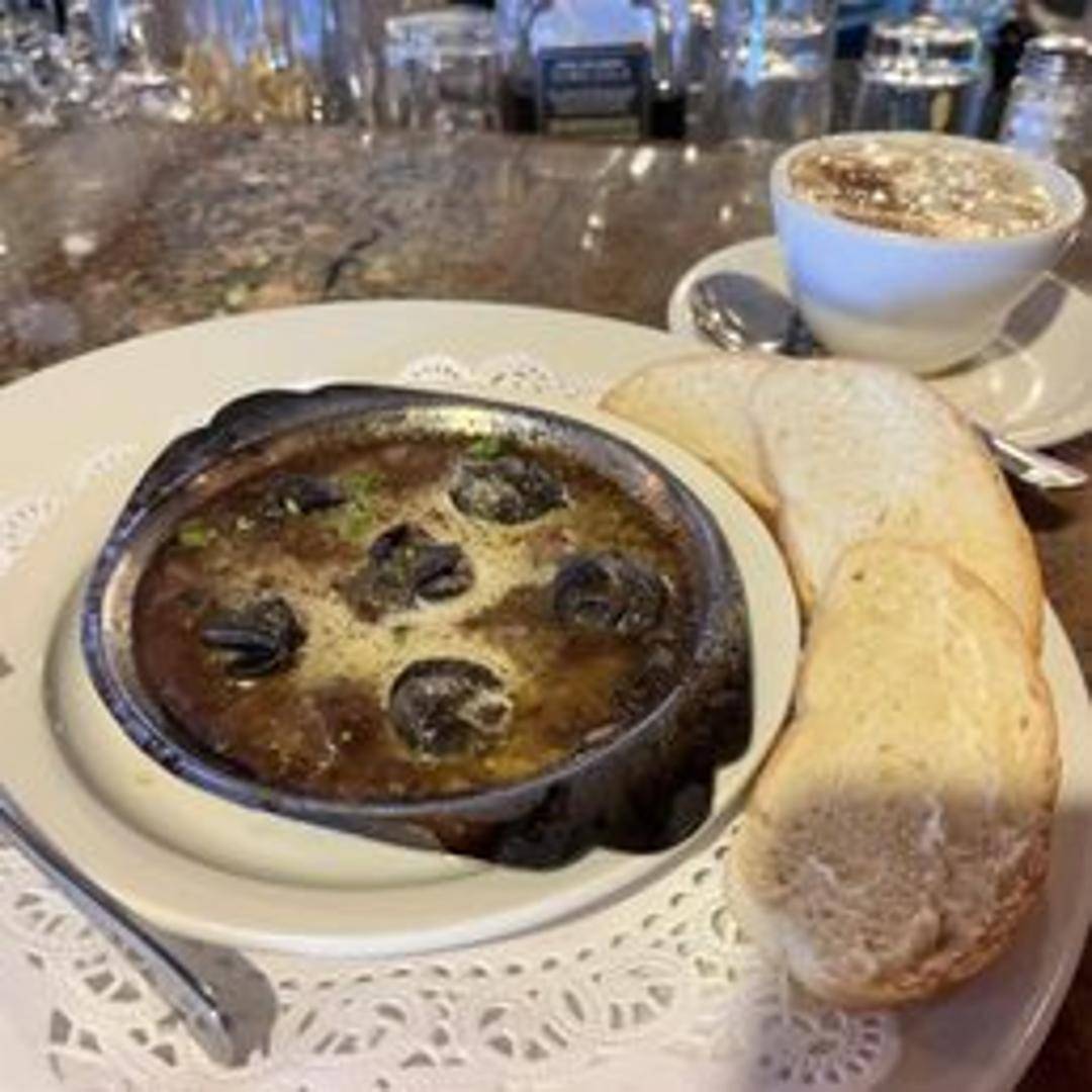 Tender snails baked in garlic herb butter. Served in a traditional escargot dish with crusty bread for dipping.