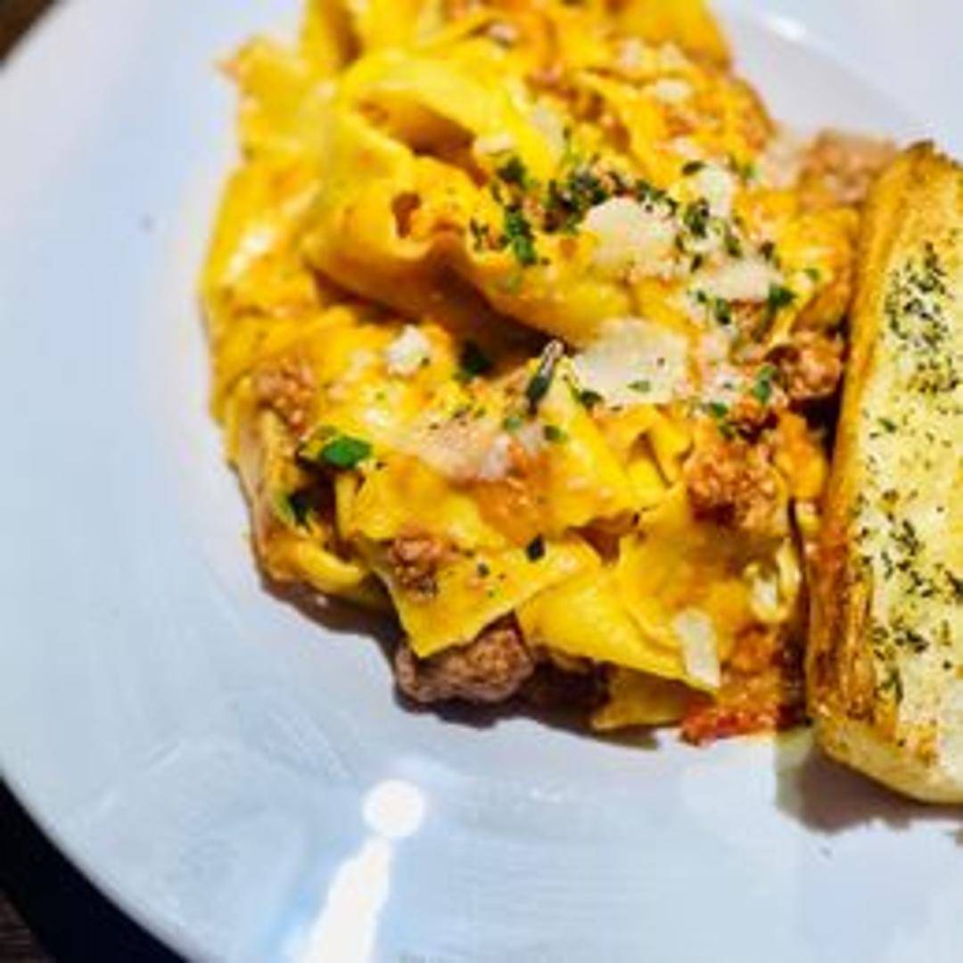 Wide pappardelle pasta served with a slow-cooked, hearty Bolognese sauce made with ground meat, vegetables, and tomatoes. A classic Italian comfort food.