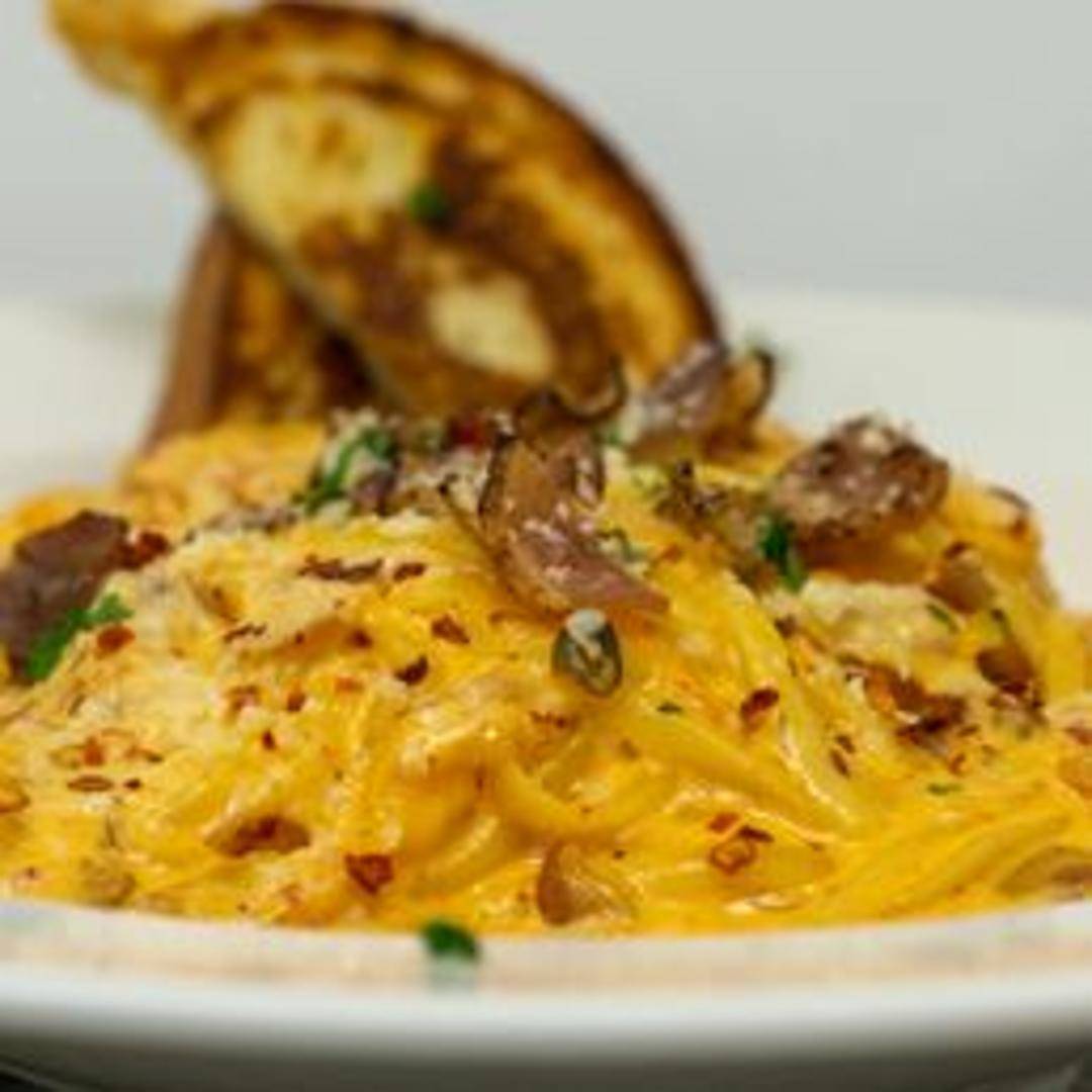 A unique fusion dish featuring al dente pasta tossed in a creamy sauce with crispy bacon and Anju House's homemade kimchi. The tangy kimchi perfectly complements the salty bacon and rich sauce, creating a balanced and unforgettable flavor profile.