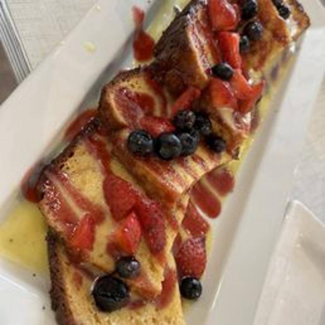 Brioche bread dipped in vanilla cinnamon custard, grilled golden brown and topped with fresh berries, whipped cream, and a dusting of powdered sugar. Served with your choice of side.