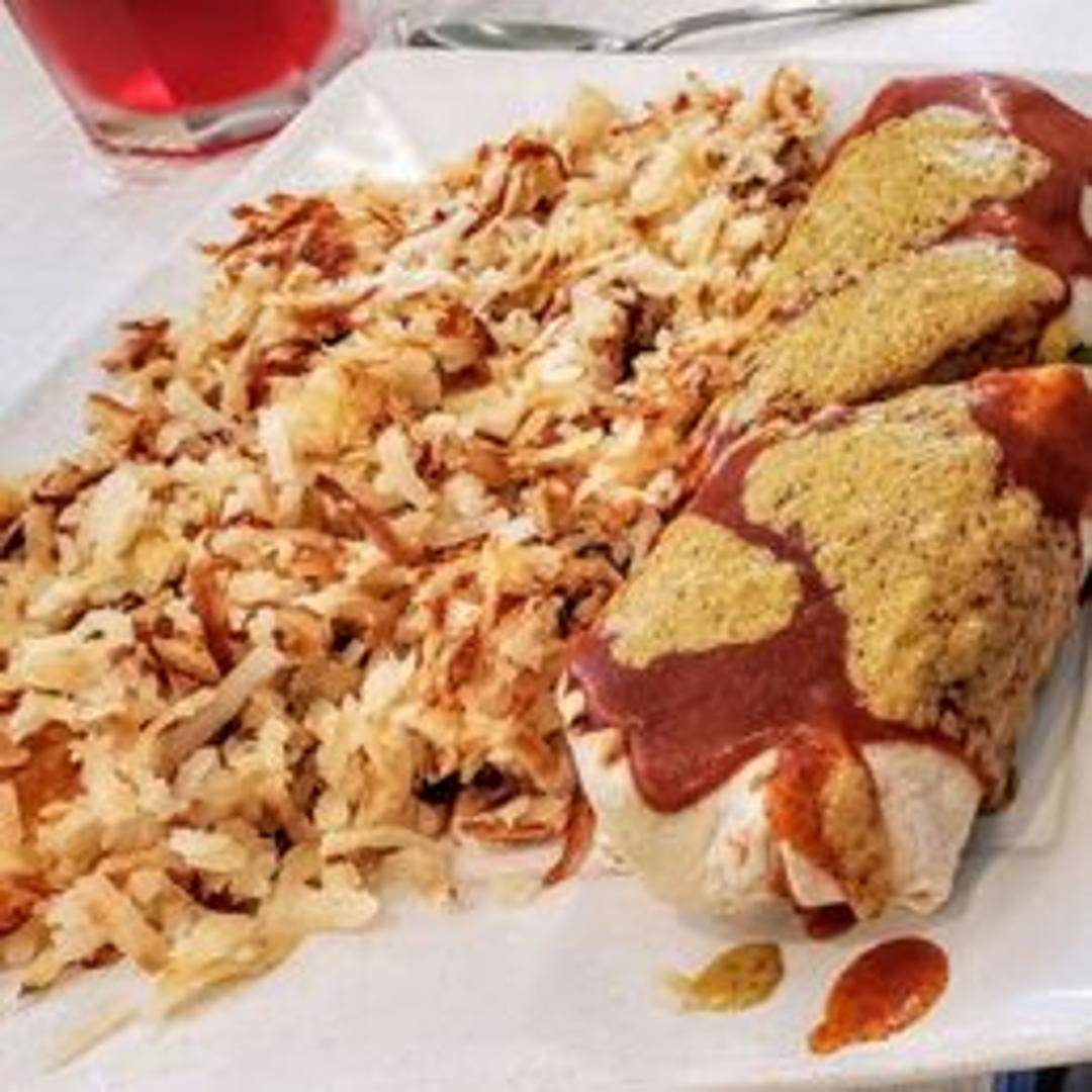 Scrambled eggs, choice of meat (bacon, sausage, or chorizo), potatoes, cheese, and salsa wrapped in a warm tortilla.