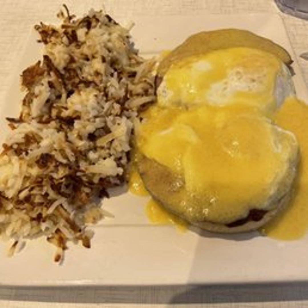 Toasted English muffin topped with Canadian bacon, poached eggs, and hollandaise sauce.