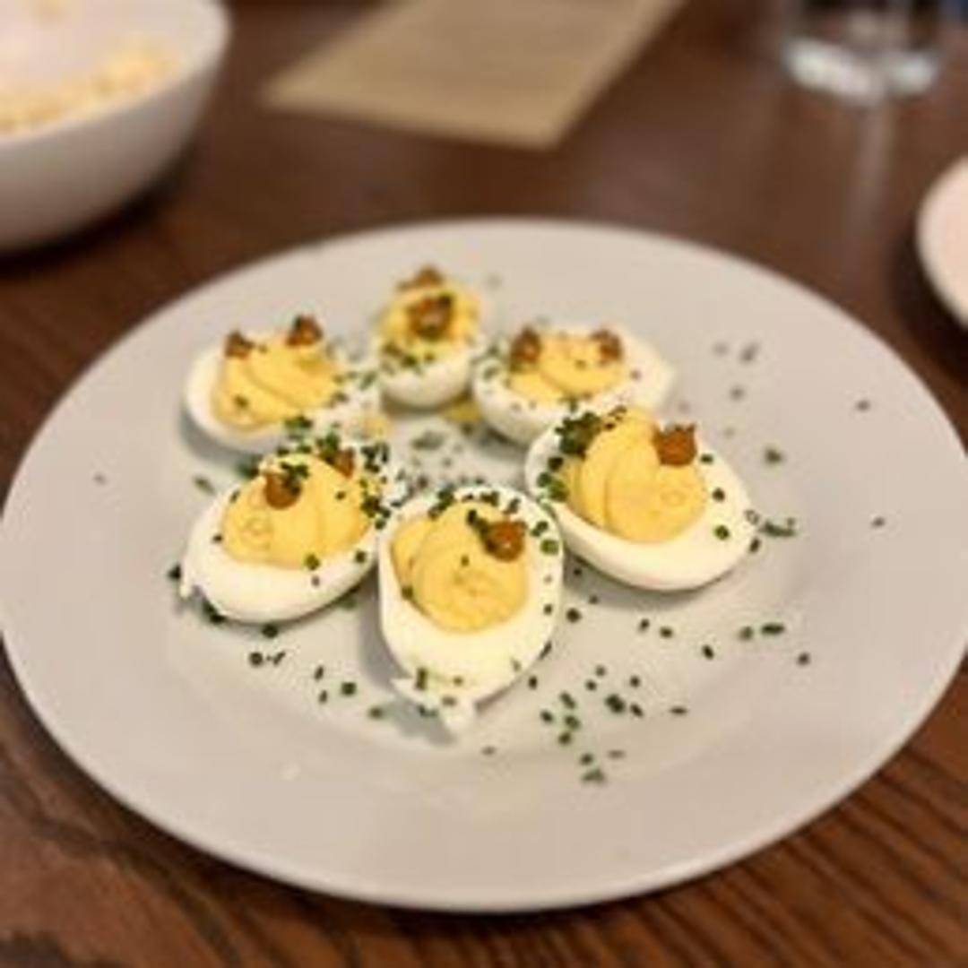Hard-boiled eggs filled with a creamy mixture of mayonnaise, mustard, and spices, often garnished with paprika.