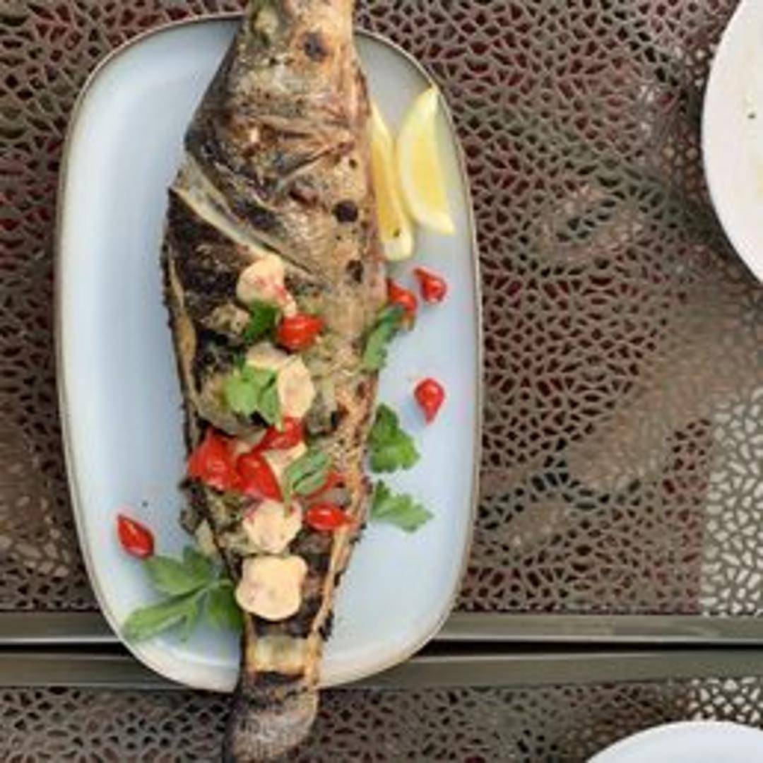 A whole fish, prepared grilled, baked, or fried, and served with seasonal accompaniments.