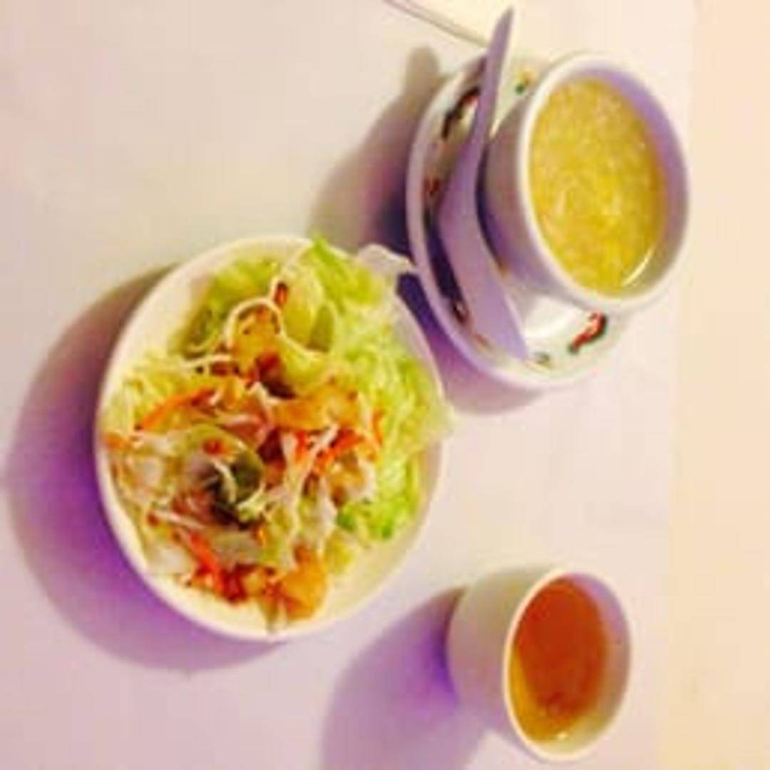 A refreshing salad featuring shredded chicken, crisp lettuce, crunchy wonton strips, toasted almonds, and sesame seeds, tossed in a tangy and sweet Asian-inspired dressing.