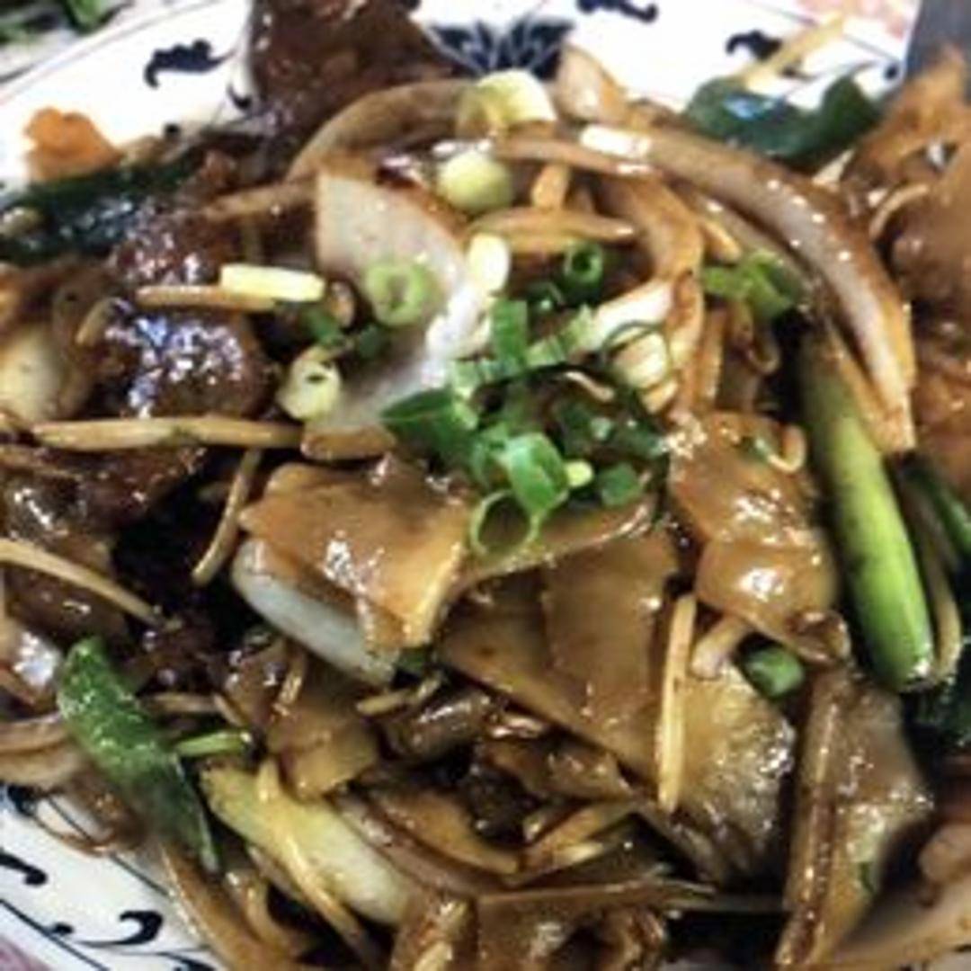 Wide, flat rice noodles stir-fried with tender slices of beef, bean sprouts, onions, and scallions in a light soy sauce-based sauce.