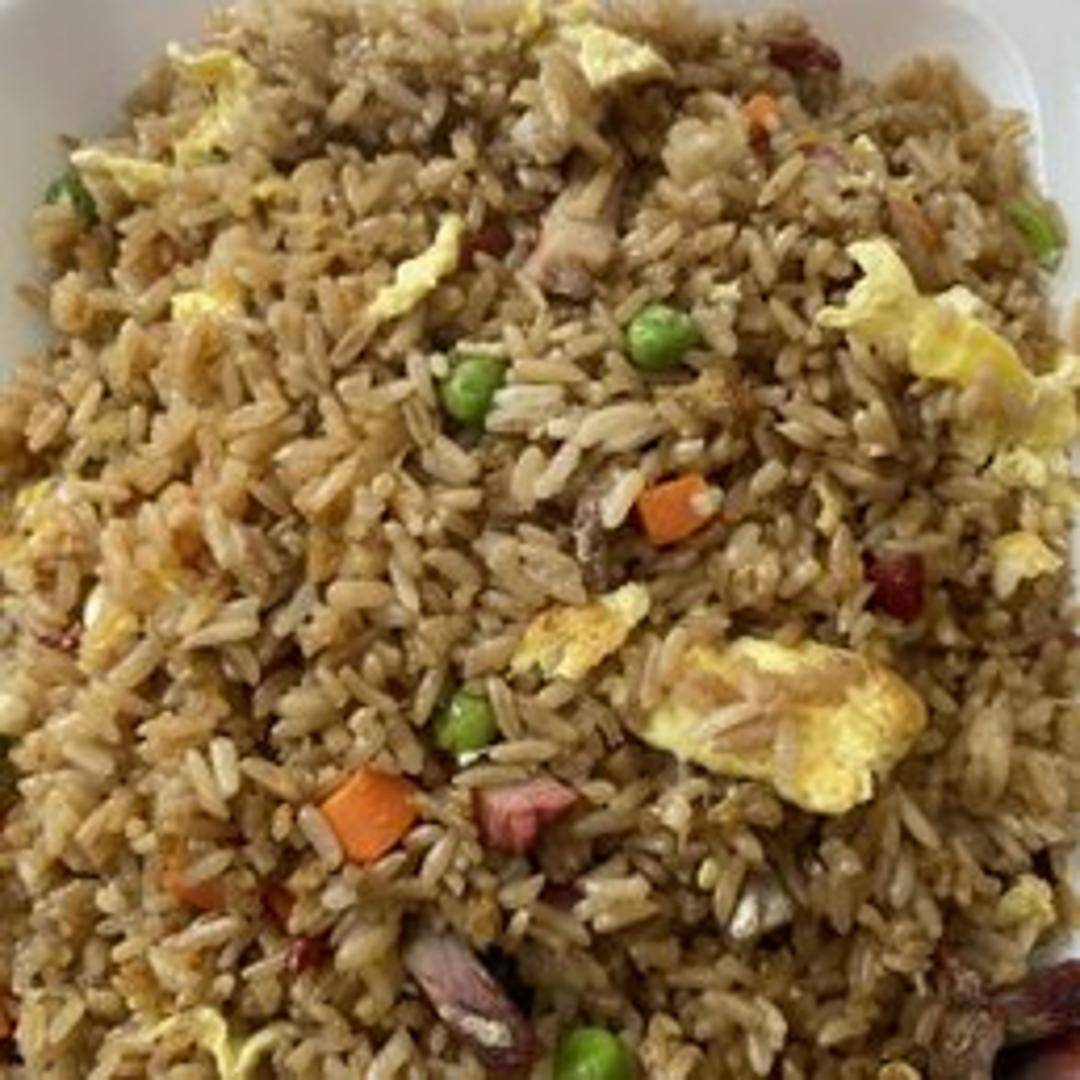 Classic fried rice dish featuring tender pieces of pork, fluffy rice, scrambled egg, diced carrots, peas, and onions, stir-fried in a savory blend of soy sauce and other Asian-inspired seasonings.