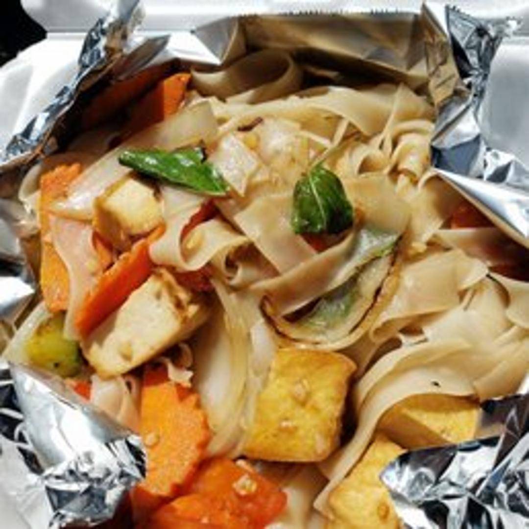 A flavorful and spicy Thai noodle dish, also known as Drunken Noodles. Wide rice noodles stir-fried with your choice of protein (typically chicken, pork, beef, tofu, or shrimp), chili peppers, garlic, basil, onions, bell peppers, tomatoes, and a savory sauce. Offers a balance of spicy, sweet, and savory flavors. Often served hot and fresh.