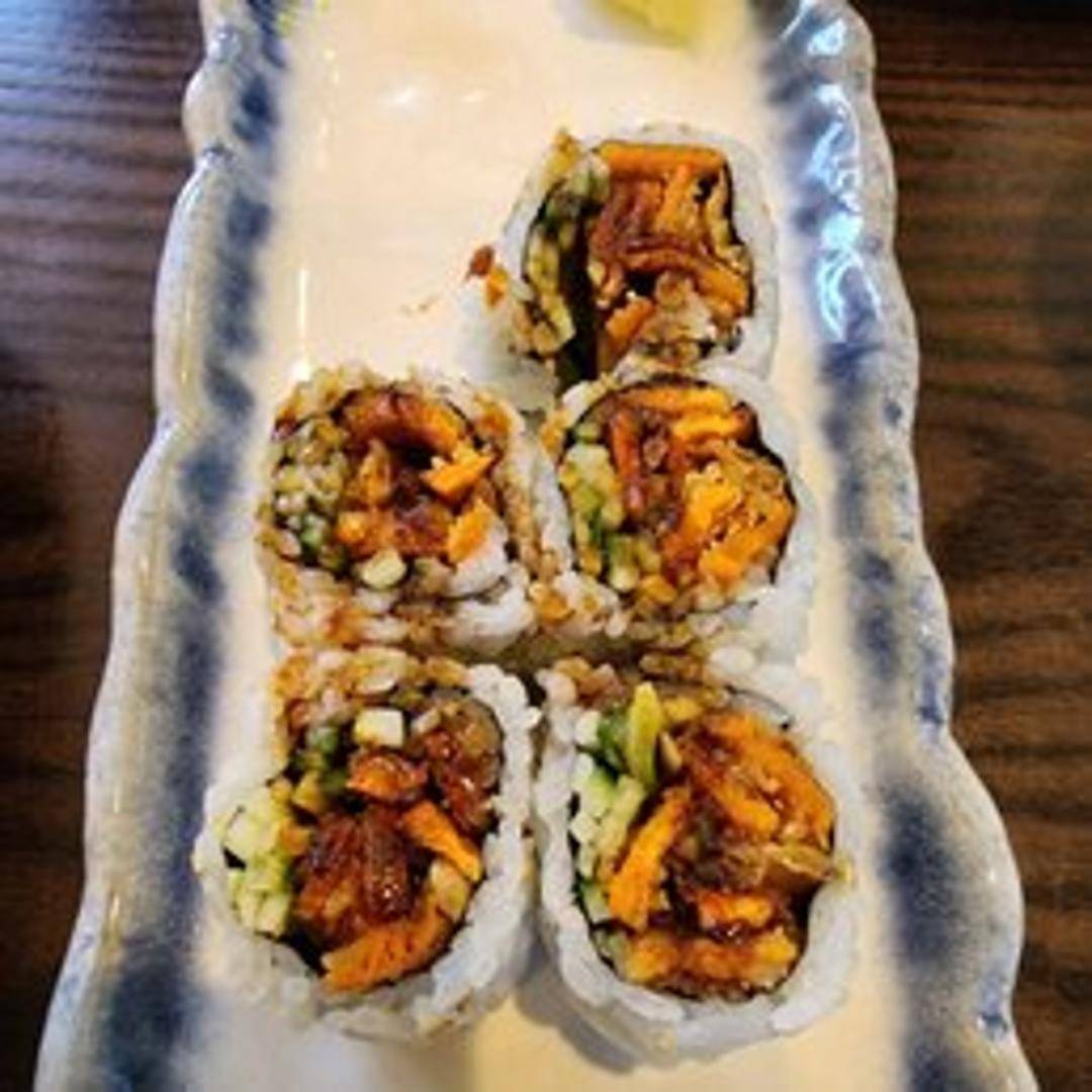 Sushi roll featuring crab stick, avocado, and cucumber, rolled in rice and seaweed.