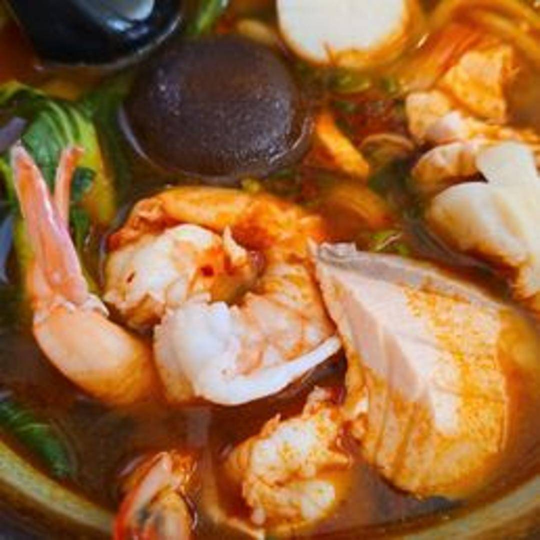 A flavorful and spicy soup filled with a variety of seafood, vegetables, and aromatic spices.