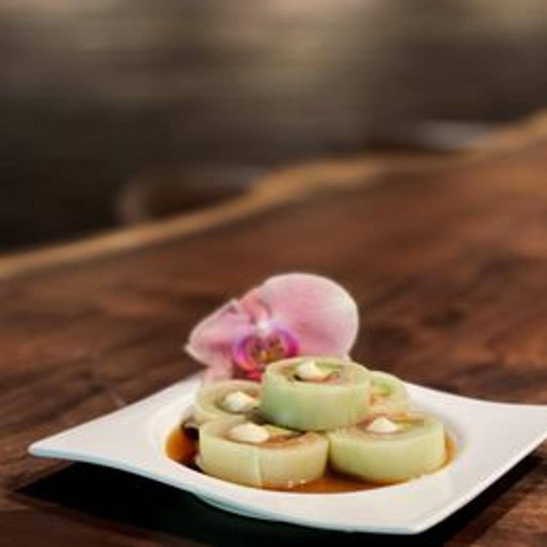 A signature sushi roll featuring a combination of fresh ingredients, often including seafood like tuna or salmon, avocado, cucumber, and special sauces. The specific ingredients and presentation may vary.