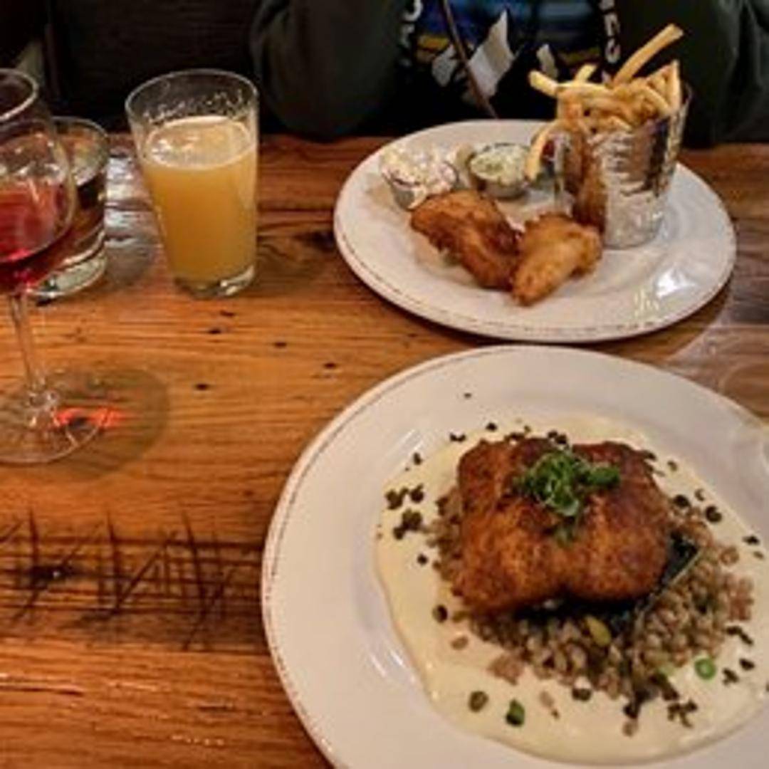 Crispy, battered fish (typically cod or haddock) served with thick-cut fries (chips). Accompanied by tartar sauce and often malt vinegar.