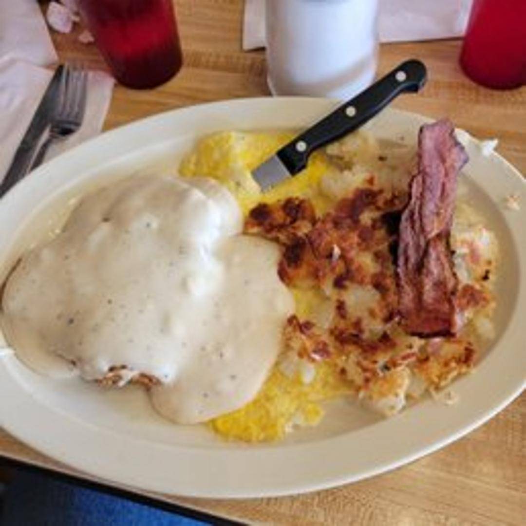 A tender steak, breaded and fried to golden perfection, smothered in creamy country gravy. Served with two eggs any style, breakfast potatoes, and your choice of toast or a biscuit.