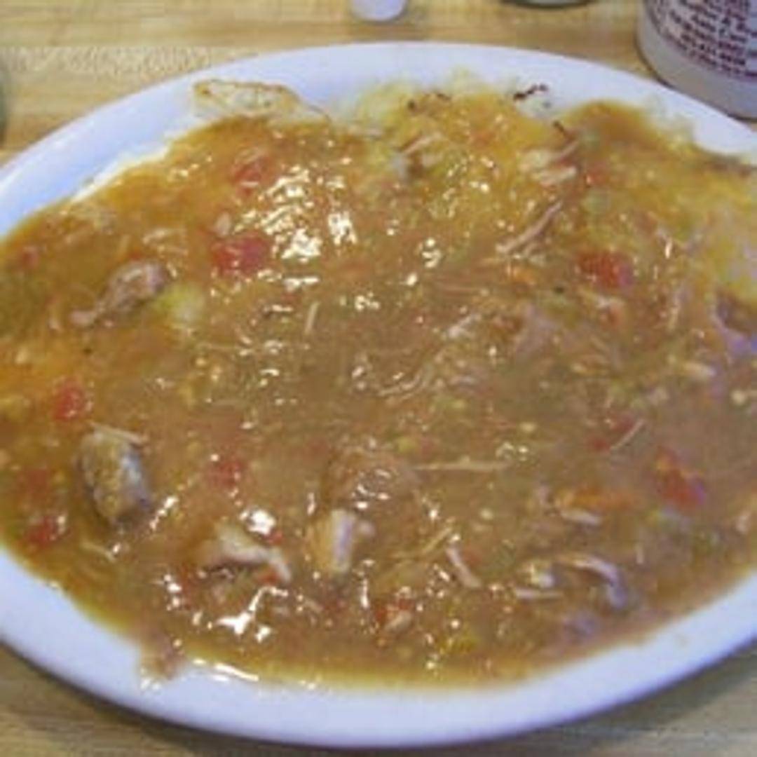 Two eggs any style served on top of crispy corn tortillas, smothered in our homemade green chili, and topped with cheese. Served with refried beans and breakfast potatoes.