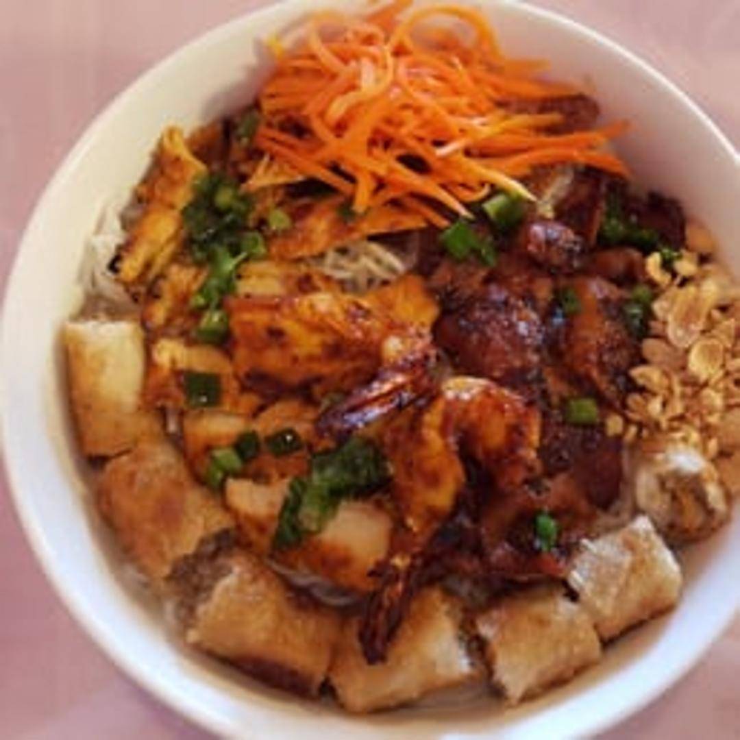 Rice noodles topped with grilled pork, egg rolls, shrimp, and fresh vegetables. Served with a side of flavorful fish sauce dressing.