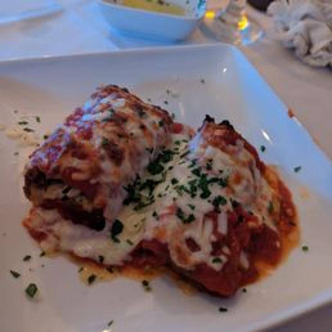 Thinly sliced eggplant, lightly battered and pan-fried, then rolled and stuffed with a creamy ricotta cheese filling. Baked in a marinara sauce and topped with melted mozzarella cheese.