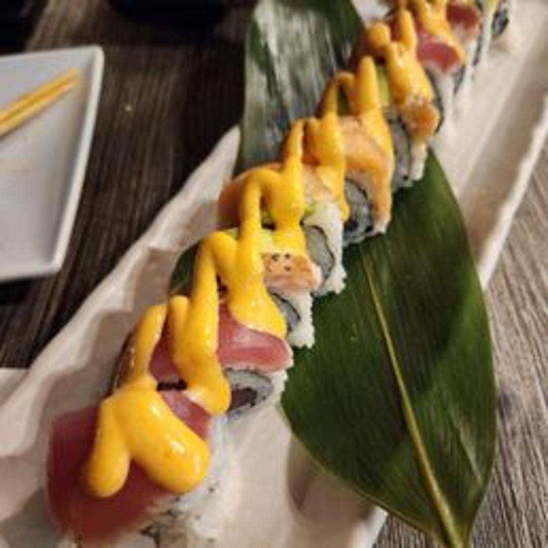 A specialty roll with ingredients that may vary, often featuring spicy tuna and avocado inside. Topped with seared tuna and a special sauce, such as spicy mayo or eel sauce.
