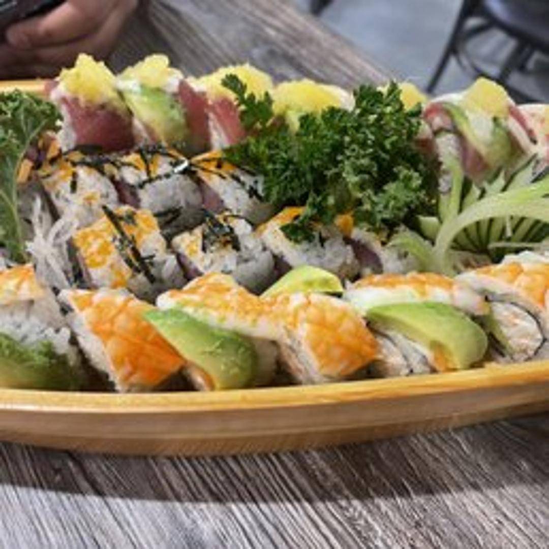 A sushi roll often containing shrimp tempura or cooked shrimp, cream cheese, and pineapple or mango, wrapped in seaweed and rice, and sometimes drizzled with a sweet sauce.