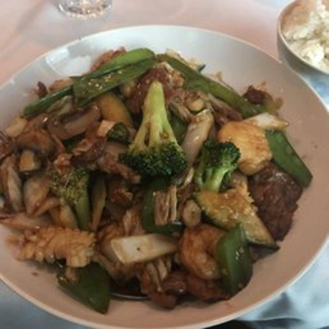 A robust and celebratory Chinese-American entree, 'Happy Family' combines a delightful medley of premium meats including succulent sliced chicken, tender beef, and plump shrimp. These are stir-fried with an assortment of fresh garden vegetables such as crisp broccoli, snow peas, carrots, mushrooms, and bell peppers, all bathed in a rich, savory brown sauce.