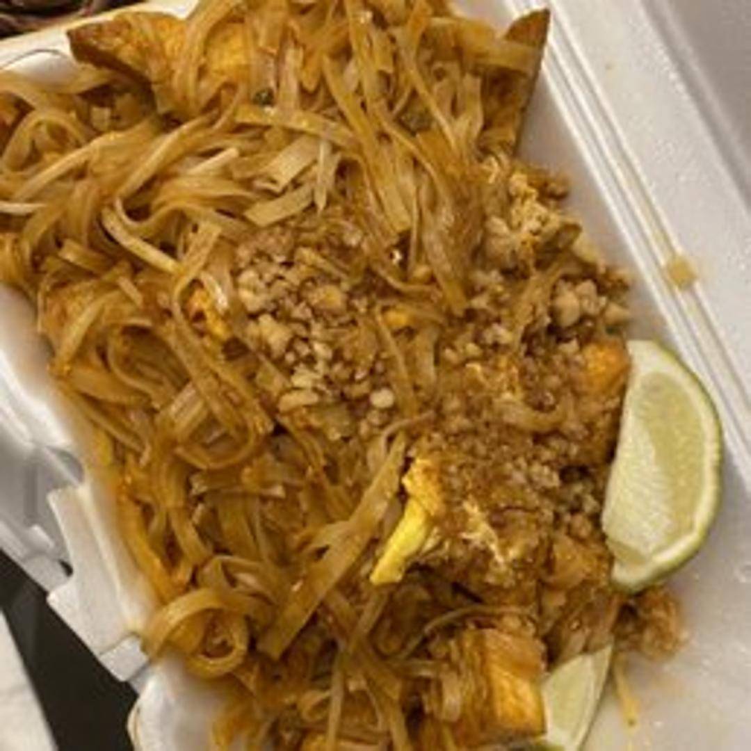 A classic Thai stir-fried noodle dish featuring tender rice noodles tossed with your choice of protein (chicken, shrimp, or tofu), scrambled eggs, crunchy bean sprouts, and aromatic green onions. Finished with a squeeze of fresh lime, crushed peanuts, and a savory-sweet tamarind sauce, offering a harmonious blend of flavors.