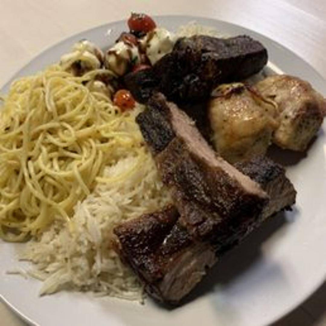 A combination plate featuring a variety of Brazilian flavors. Specific items included may vary, but typically includes a selection of meats, sides, and a beverage. Ask for details on today's offering.