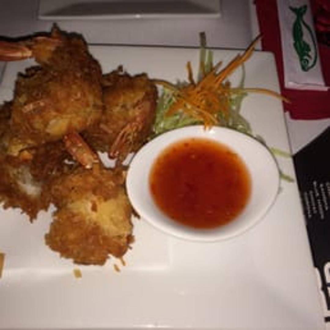Crispy and golden-fried shrimp coated in a light, airy tempura batter infused with the subtle sweetness of coconut. Each bite offers a delightful crunch followed by succulent shrimp, often served with a sweet and tangy dipping sauce for a perfect balance of flavors.