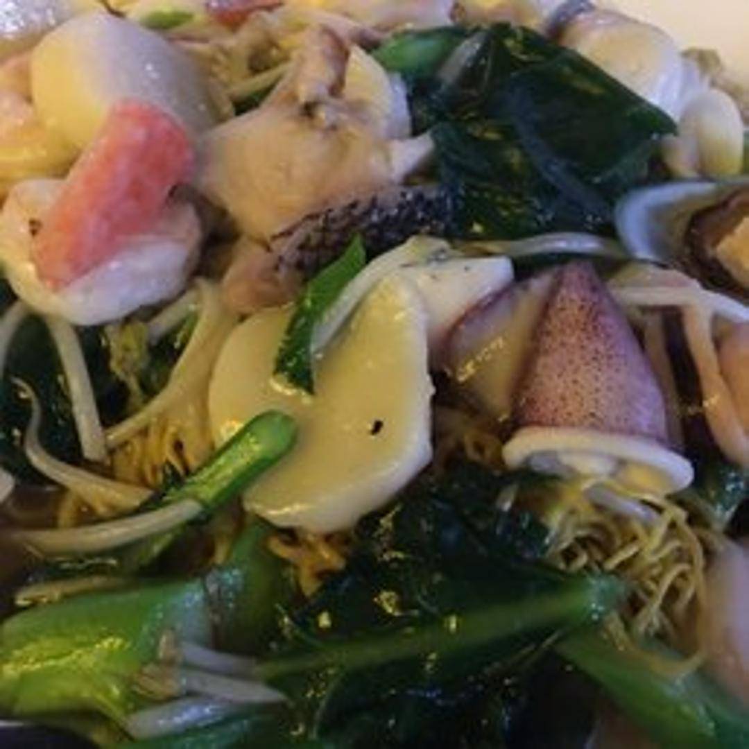 Crispy pan-fried egg noodles topped with a flavorful seafood gravy. The gravy typically includes shrimp, squid, scallops, and other seafood, along with vegetables such as bok choy, mushrooms, and carrots. The noodles offer a satisfying crunch contrasting with the soft, savory seafood and vegetables.
