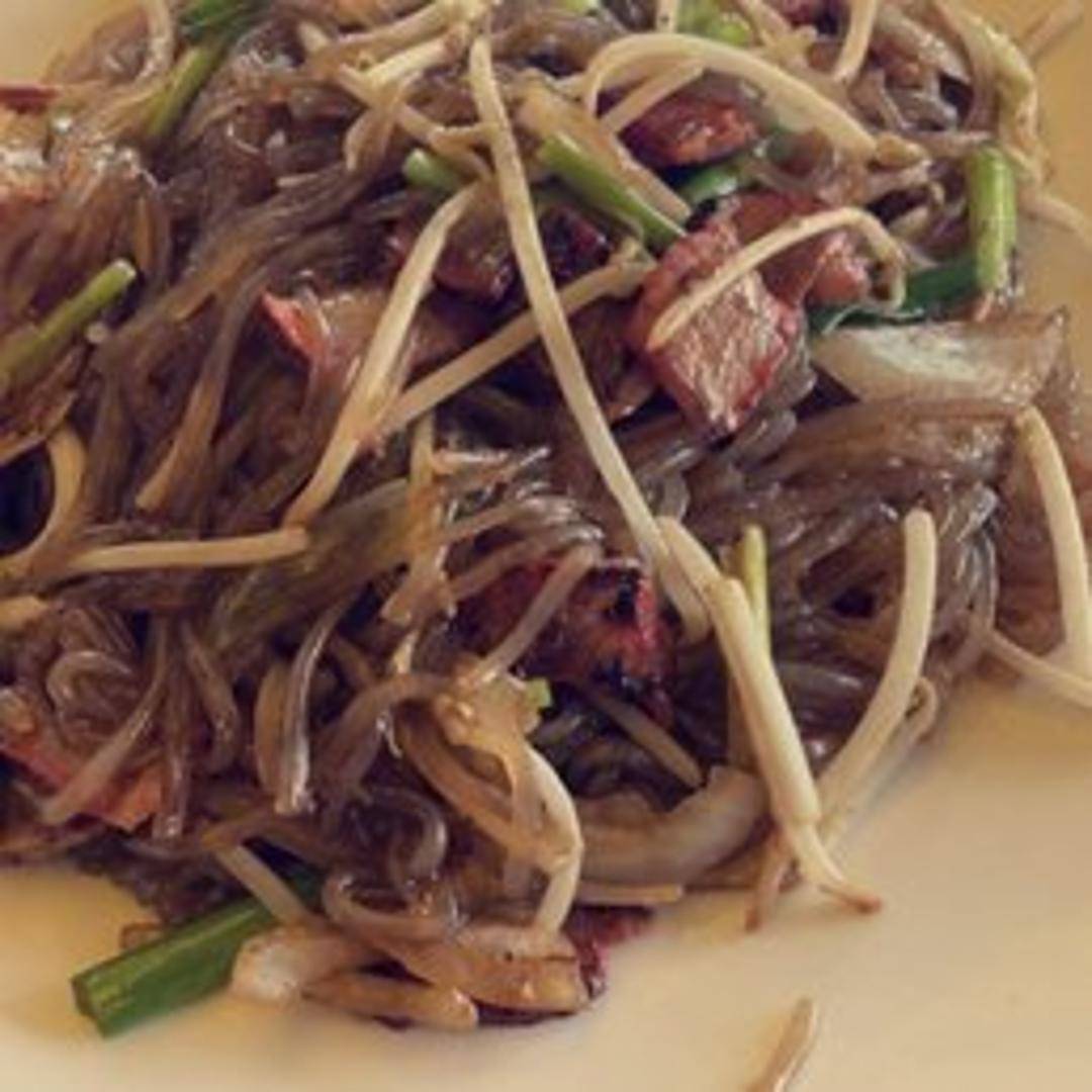 Translucent glass noodles (also known as cellophane noodles or bean thread noodles) stir-fried with a medley of colorful vegetables such as bell peppers, onions, and carrots, along with your choice of protein. The dish is seasoned with soy sauce, sesame oil, and other flavorful sauces for a light yet satisfying meal.