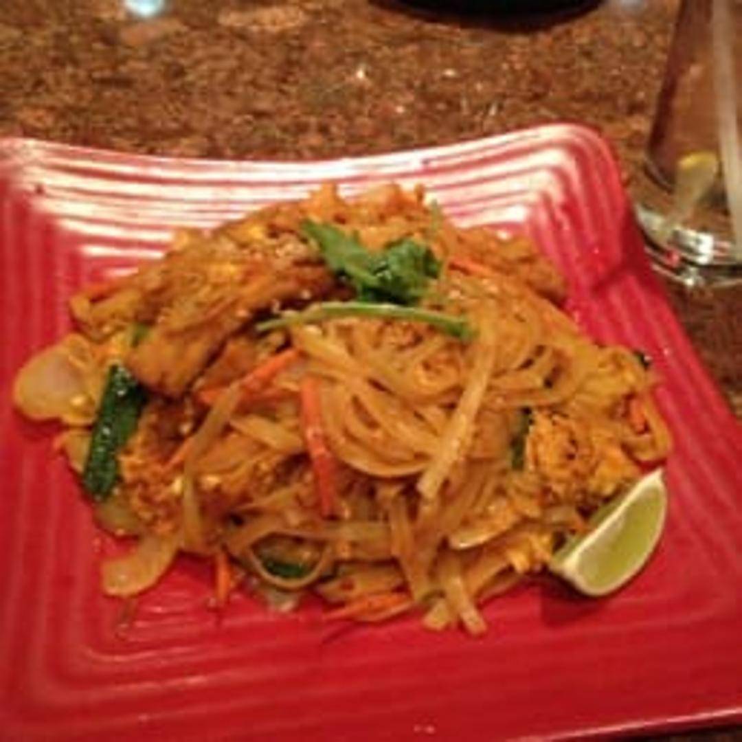 Rice noodles stir-fried with egg, bean sprouts, scallions, and peanuts in a tangy tamarind sauce, prepared gluten-free. Lunch portion.