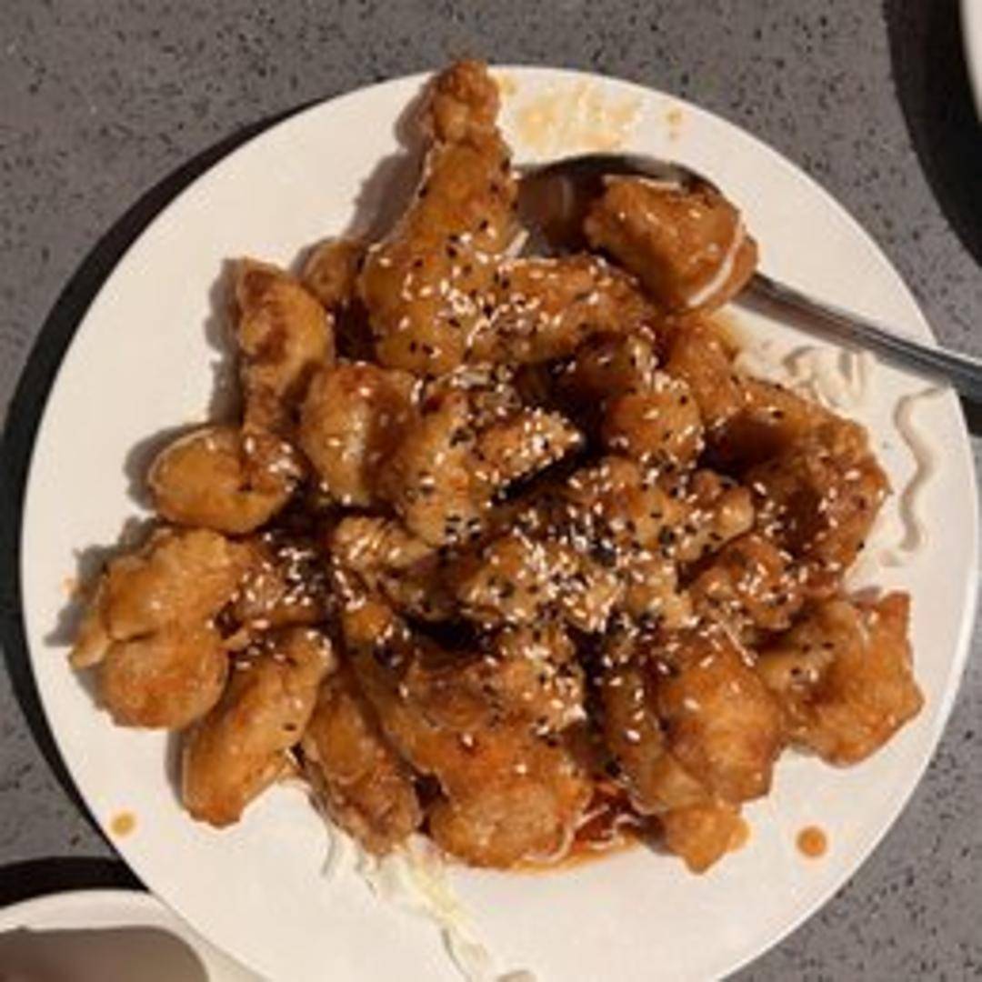 Crispy, battered chicken coated in a sweet and savory sesame sauce. Served with steamed rice.