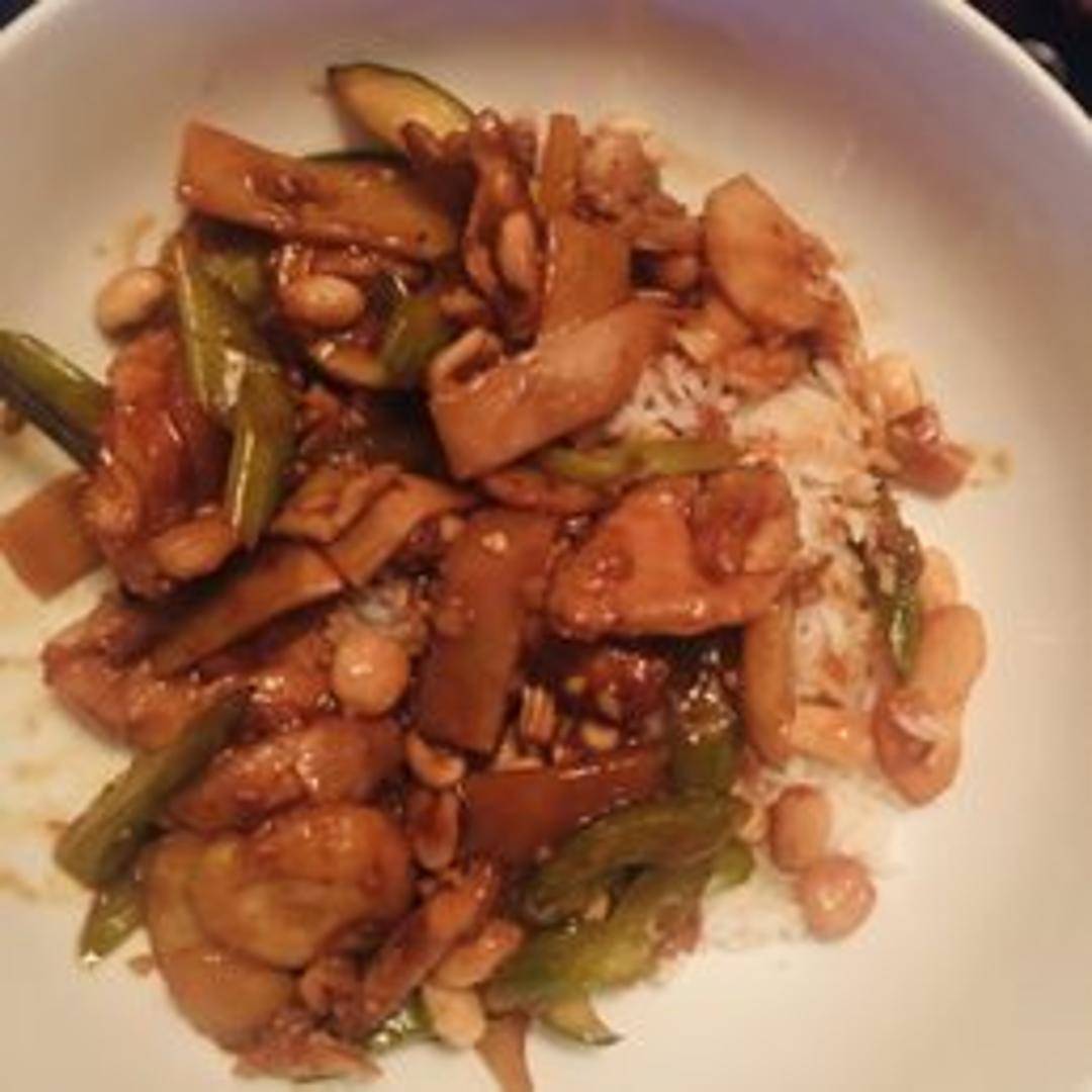 Diced chicken stir-fried with peanuts, vegetables, and chili peppers in a savory and slightly spicy Kung Pao sauce. Served with steamed rice.