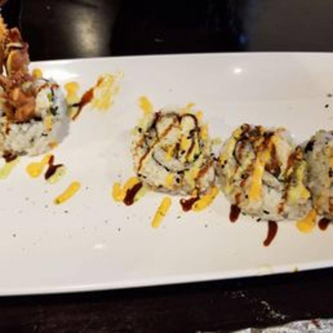 Soft shell crab tempura, avocado, cucumber, sprouts, and tobiko rolled in seaweed and rice, served with eel sauce.