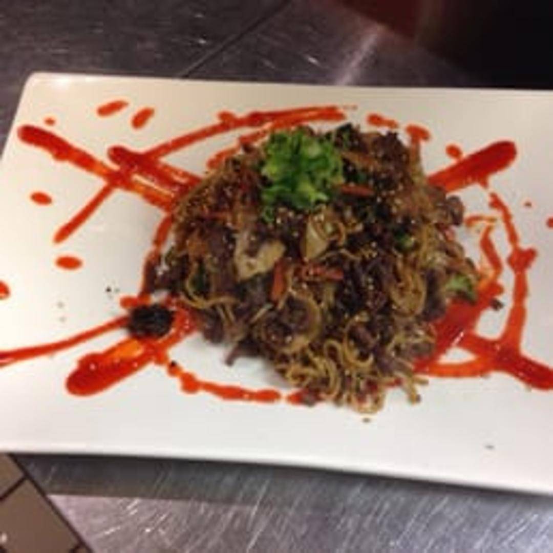 A flavorful and fiery ramen noodle soup featuring tender pieces of chicken, vibrant vegetables, and a rich, spicy broth. Garnished with traditional ramen toppings for an authentic and satisfying experience.
