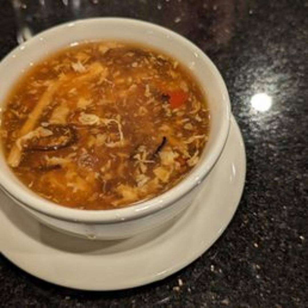 A flavorful and spicy soup with tofu, mushrooms, bamboo shoots, and egg drops in a thickened broth.