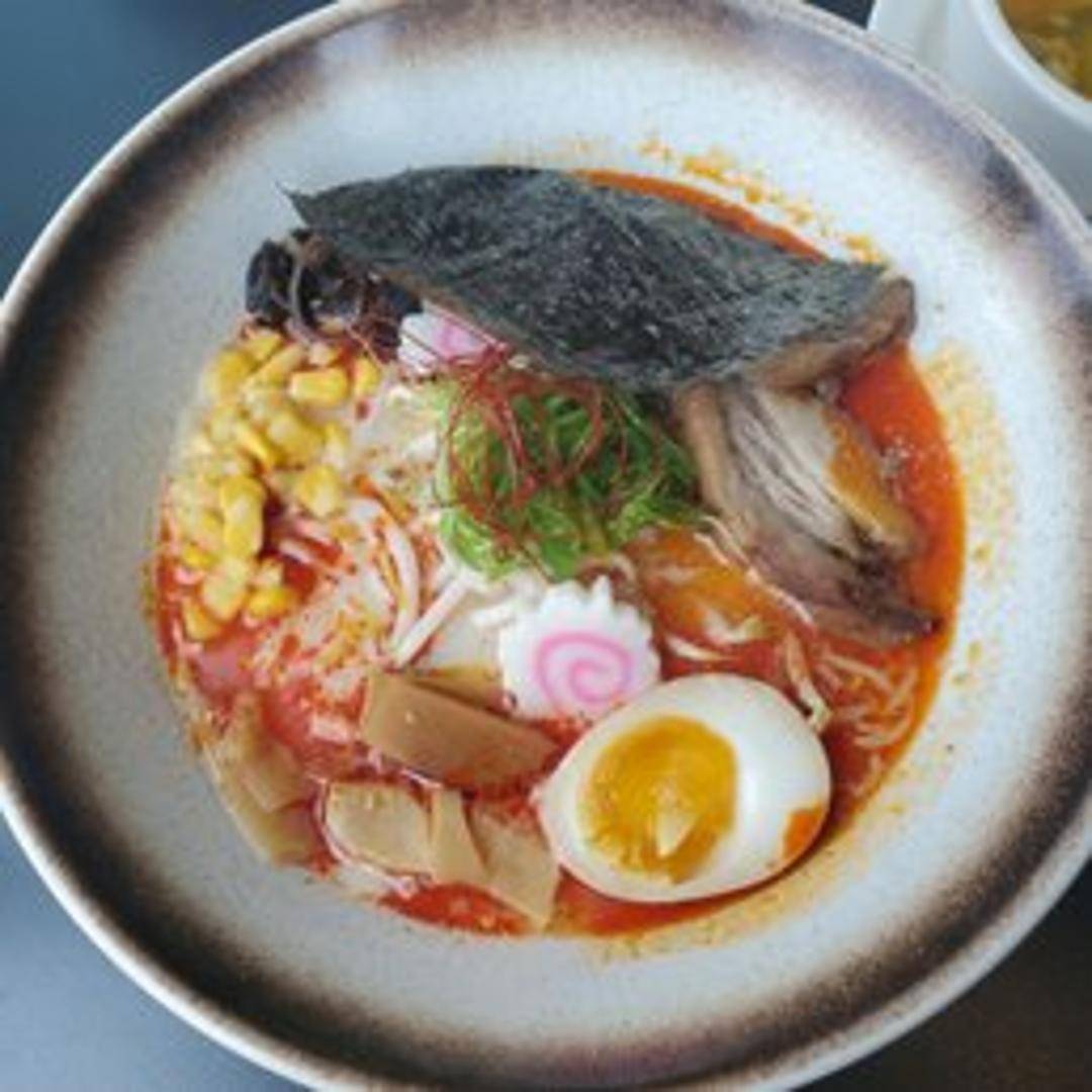 Spicy ramen noodle soup with ground pork, sesame paste, chili oil, and vegetables.