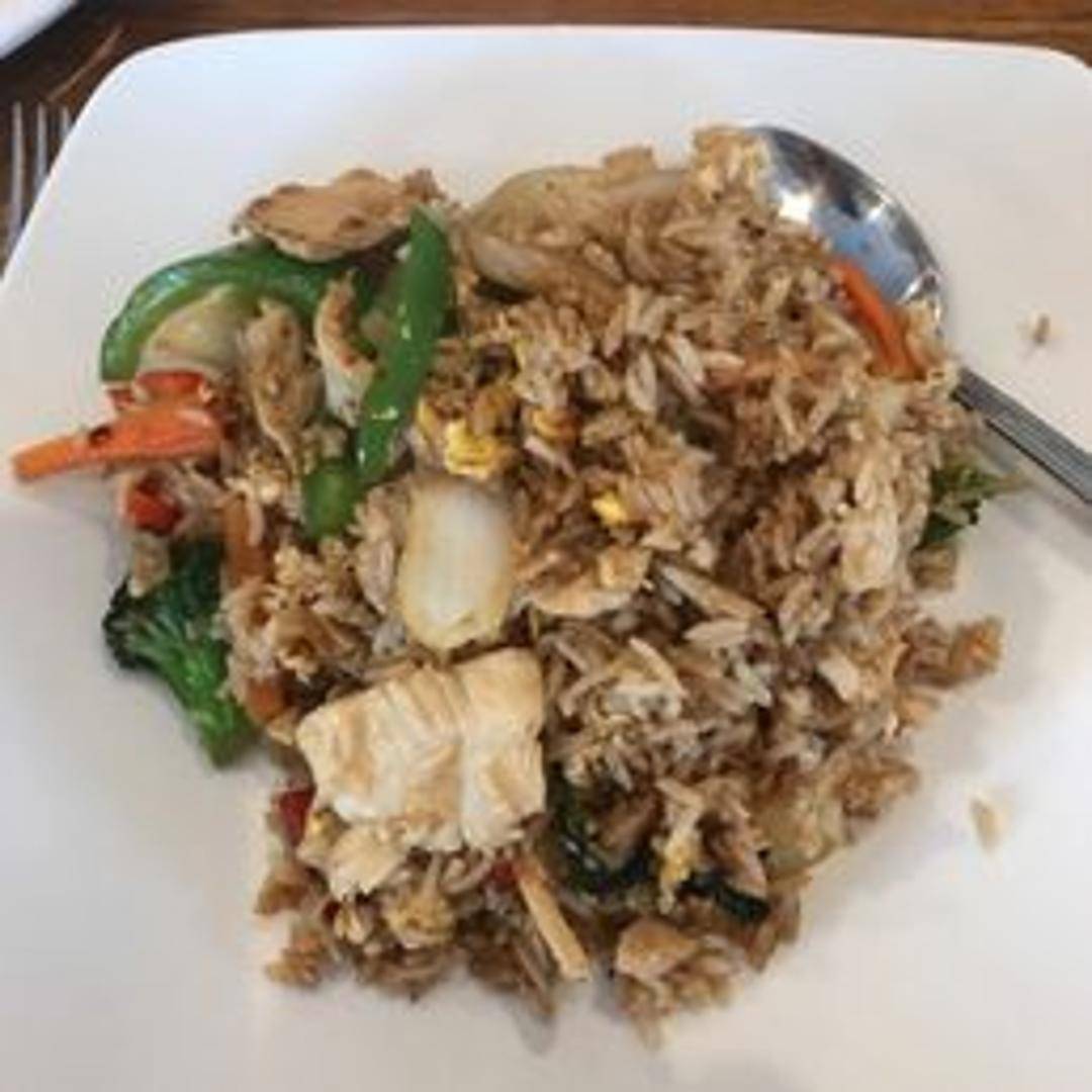 A fragrant and flavorful Thai-inspired fried rice dish, characterized by its aromatic fresh Thai basil leaves. Jasmine rice is stir-fried to perfection with eggs, onions, and bell peppers, delivering a savory and slightly spicy kick. This vibrant dish offers a delightful blend of textures and tastes, making it a popular choice for those who enjoy a hint of spice and fresh herbs.