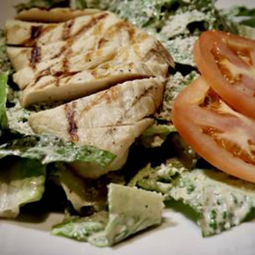 Grilled chicken breast atop crisp romaine lettuce, tossed in classic Caesar dressing with croutons and parmesan cheese.