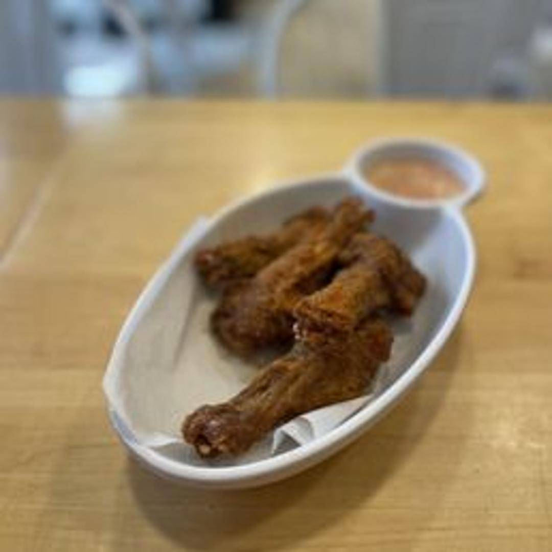 Duck wings seasoned and prepared, often deep-fried or grilled, and served with a dipping sauce.