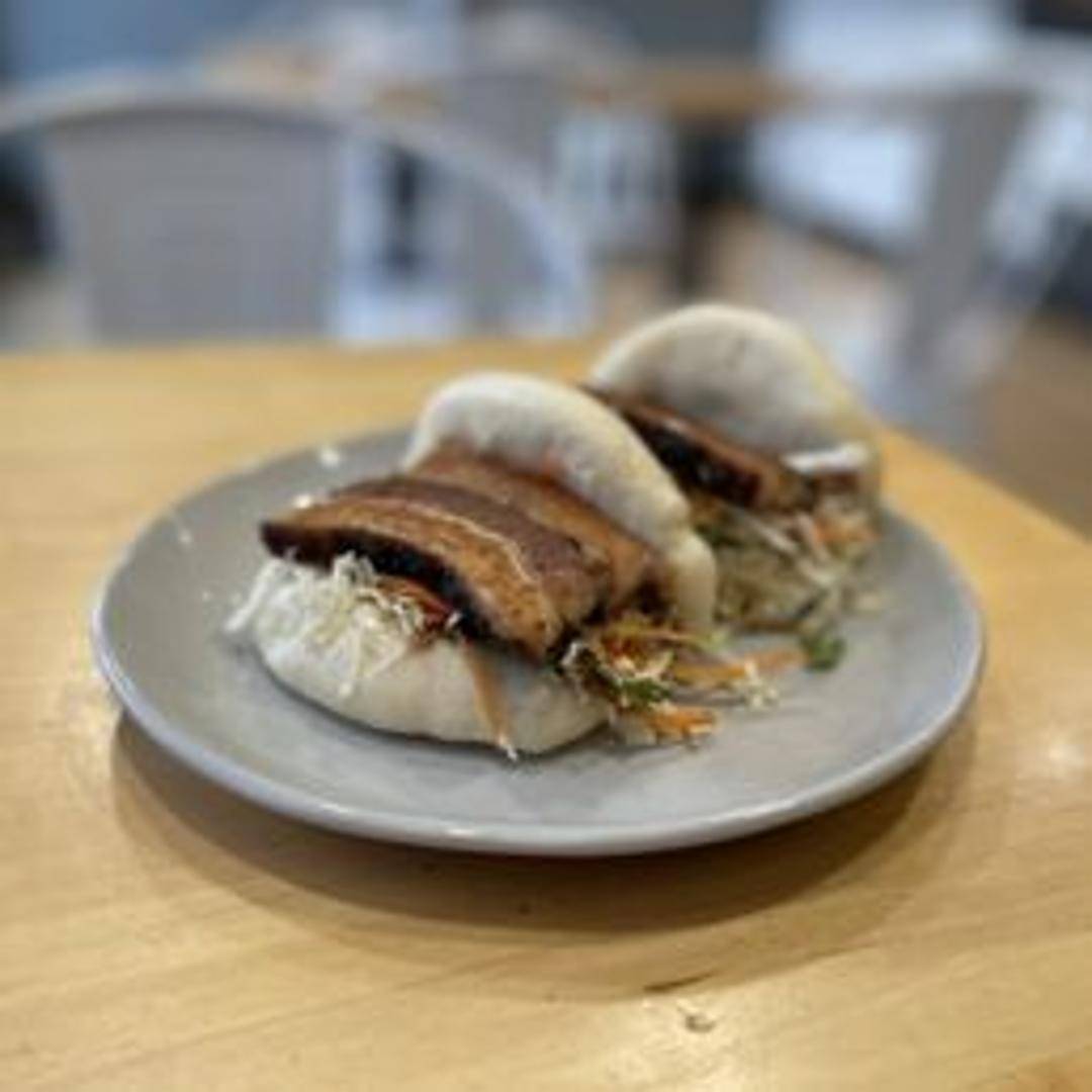 Soft, fluffy steamed buns filled with tender, braised pork belly, pickled vegetables, and a sweet and savory sauce.