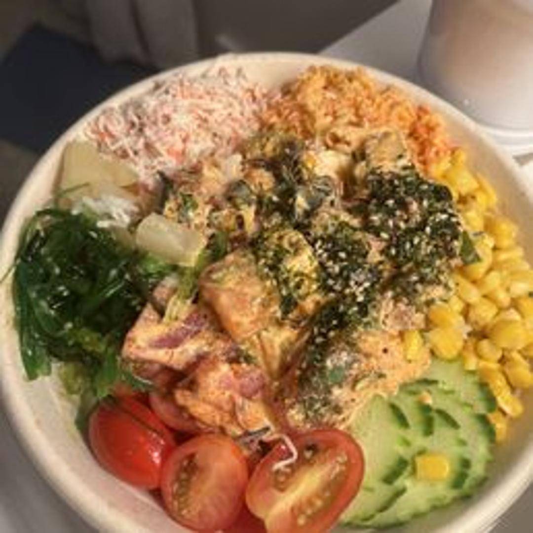 A vibrant and colorful poke bowl featuring a variety of fresh fish, vegetables, and toppings. Customizable with your choice of protein, base, and sauces.