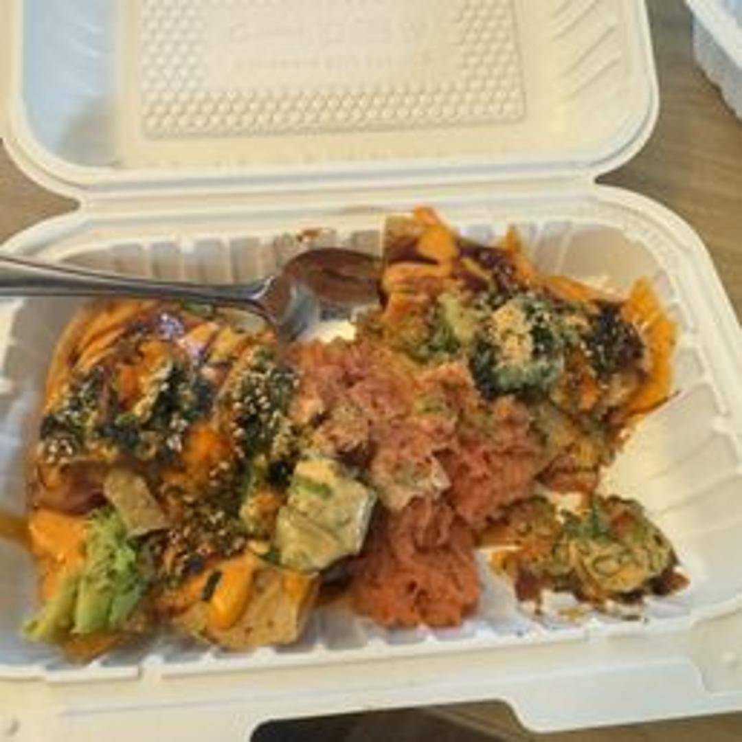 A flavorful poke bowl with sushi-grade tuna marinated in a spicy sauce. Served over sushi rice and topped with avocado, seaweed salad, edamame, cucumber, sesame seeds, and a drizzle of spicy mayo.
