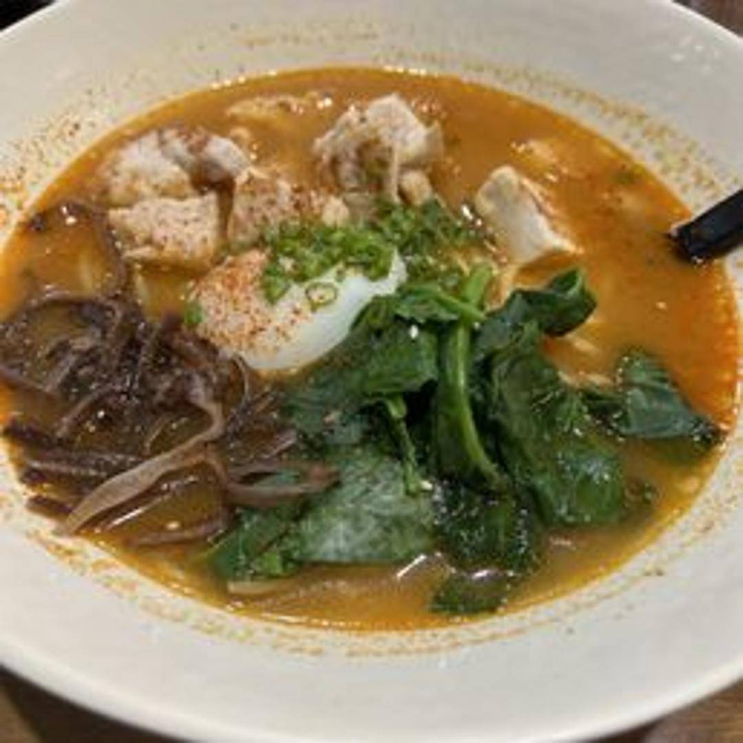 A flavorful ramen with a spicy chicken broth, topped with tender chicken, vegetables, and a soft-boiled egg. A satisfying and spicy meal.