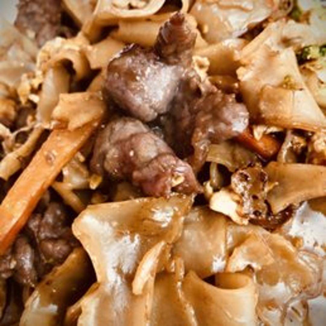 Wide rice noodles stir-fried with egg, broccoli, carrots, and your choice of protein in a sweet soy sauce.