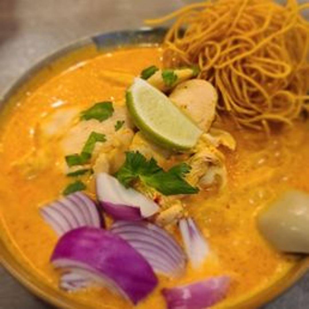 Northern Thai coconut curry noodle soup with egg noodles, your choice of protein, pickled mustard greens, red onions, lime, and crispy fried noodles.