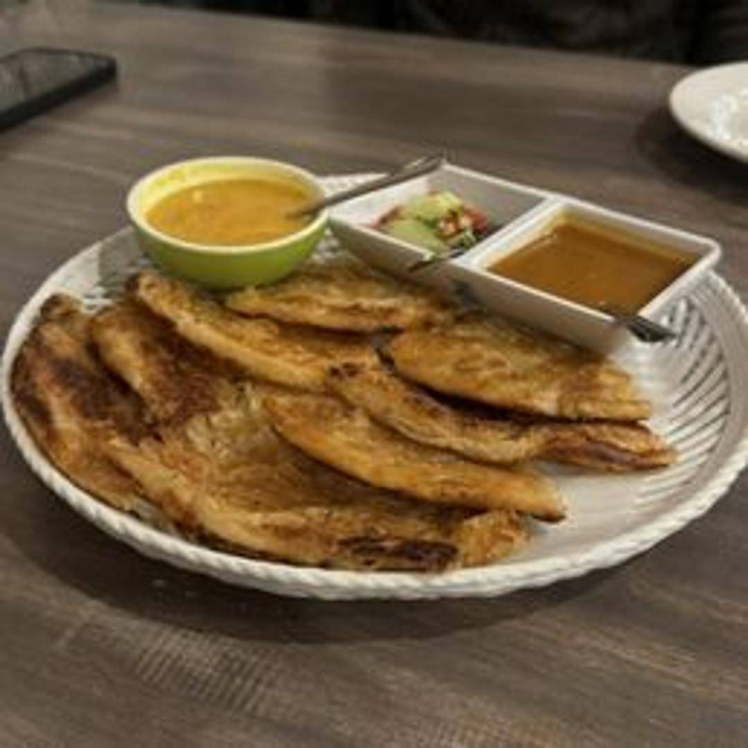 A trio of flaky, pan-fried flatbreads served with a side of savory dipping sauce.