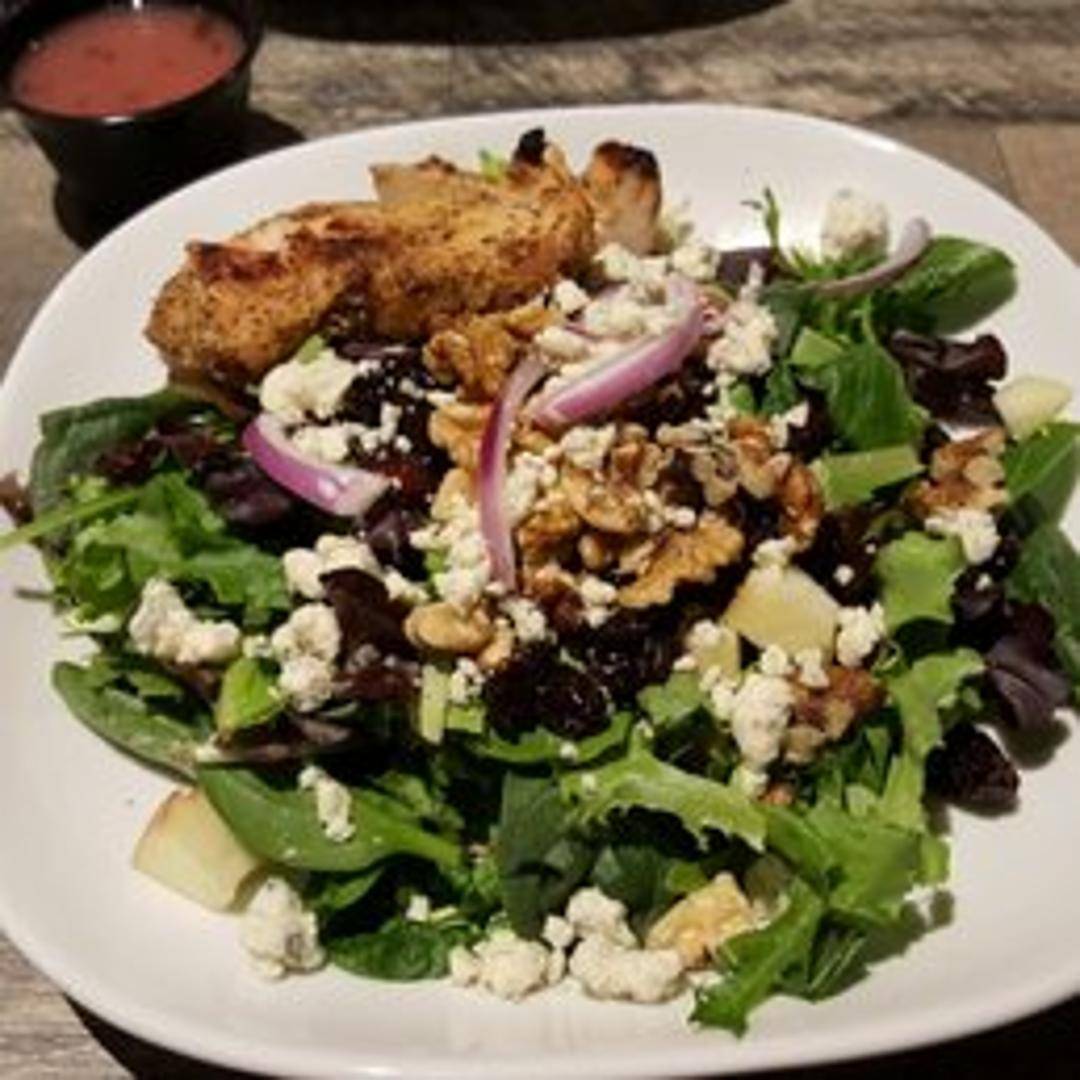 A bed of mixed greens topped with grilled chicken, dried cranberries, crumbled goat cheese, sliced apples, candied pecans, and a light maple vinaigrette dressing.