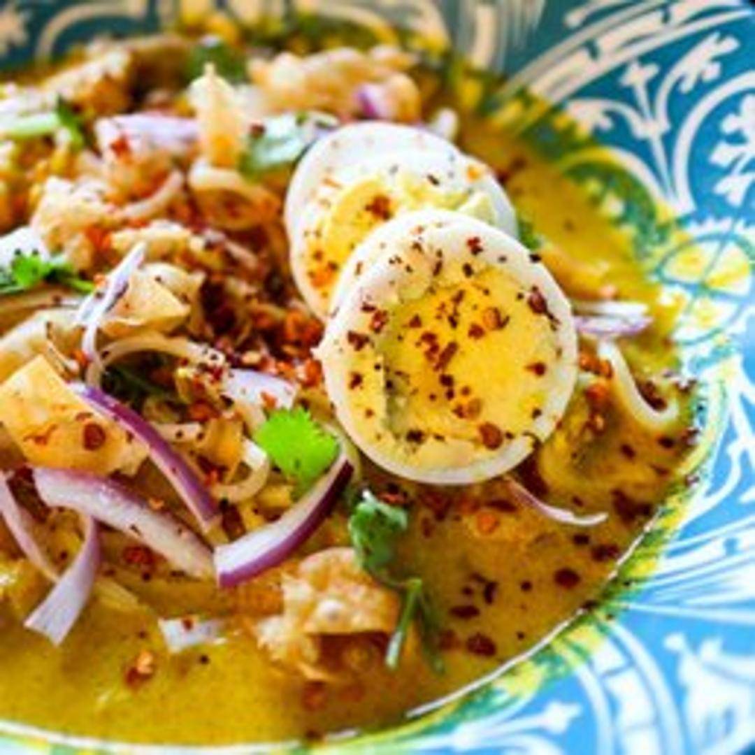 A rich and creamy coconut milk-based soup with tender chicken, noodles, and a medley of vegetables, infused with Burmese spices and herbs. Garnished with fresh cilantro and lime.